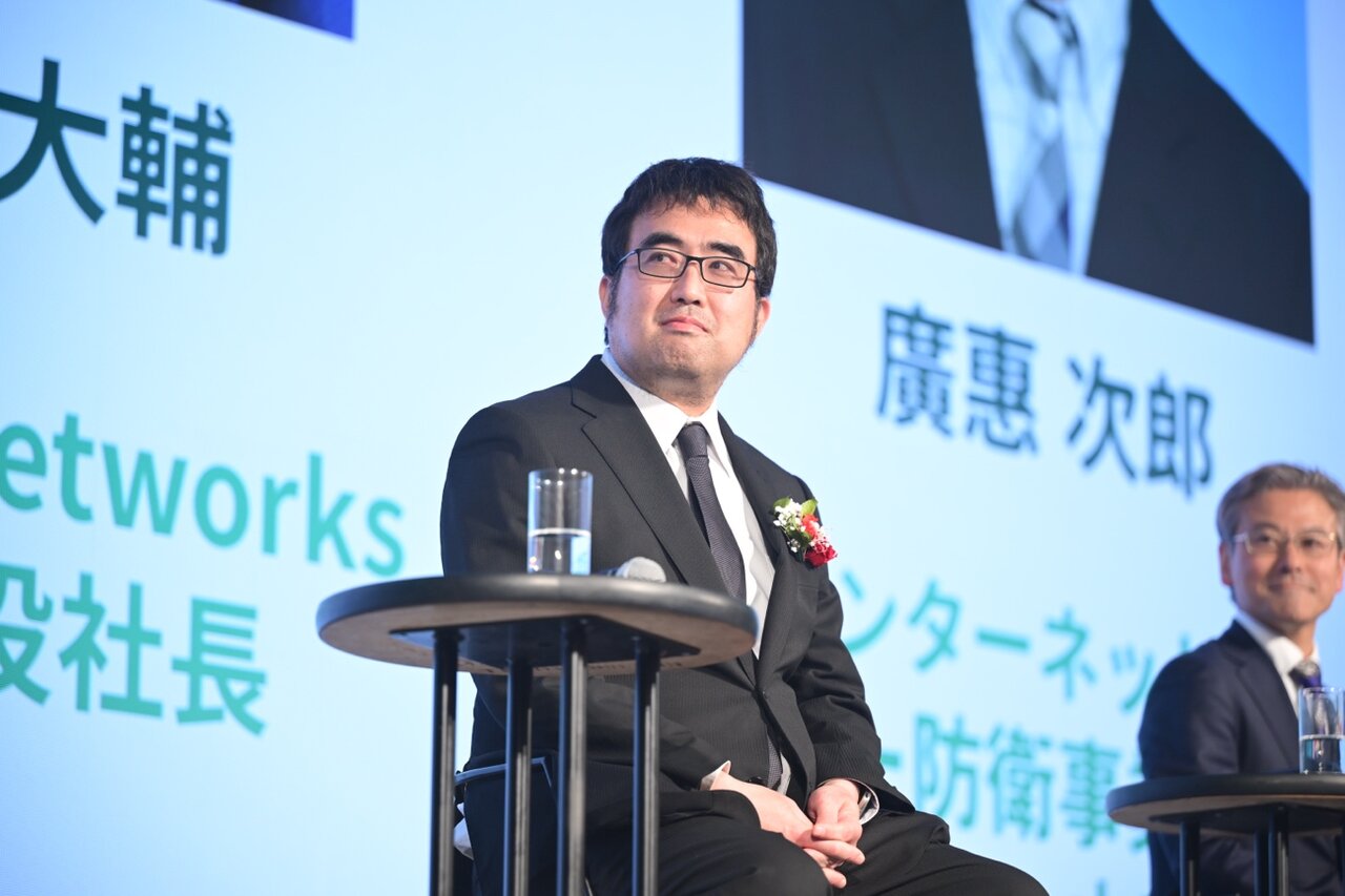 このパネルディスカッションには、Preferred Networks 代表取締役社長 岡野原大輔氏、経済産業省 大臣官房審議官 奥家敏和氏、国立研究開発法人情報通信研究機構(NICT) 主席研究員 伊東寛氏、陸上自衛隊教育訓練研究本部 研究部長 陸将補 小山直伸氏が登壇。それぞれの立場からサイバー領域と安全保障の関係について議論しました。GMOインターネットグループ サイバー防衛事業推進本部「6」本部長で元陸上自衛隊 陸将の廣惠次郎氏がモデレーターを務めました。