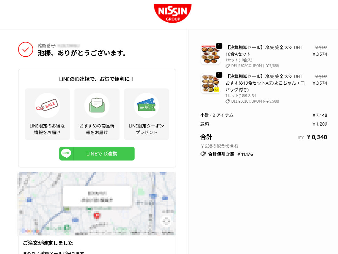 注文確定画面。2セット購入で送料込み8348円でした。単純計算で1食あたり約417円です