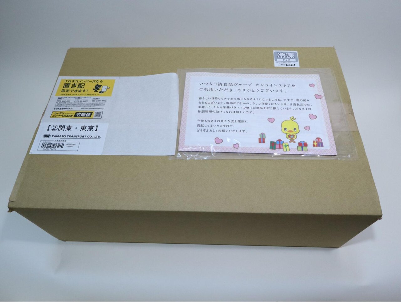 商品はシンプルな無地の段ボール箱で届きました。箱に貼られた明細書には、日清食品のマスコットキャラクター・ひよこちゃんのイラストに季節のあいさつが添えられており、ちょっとほっこりしました。