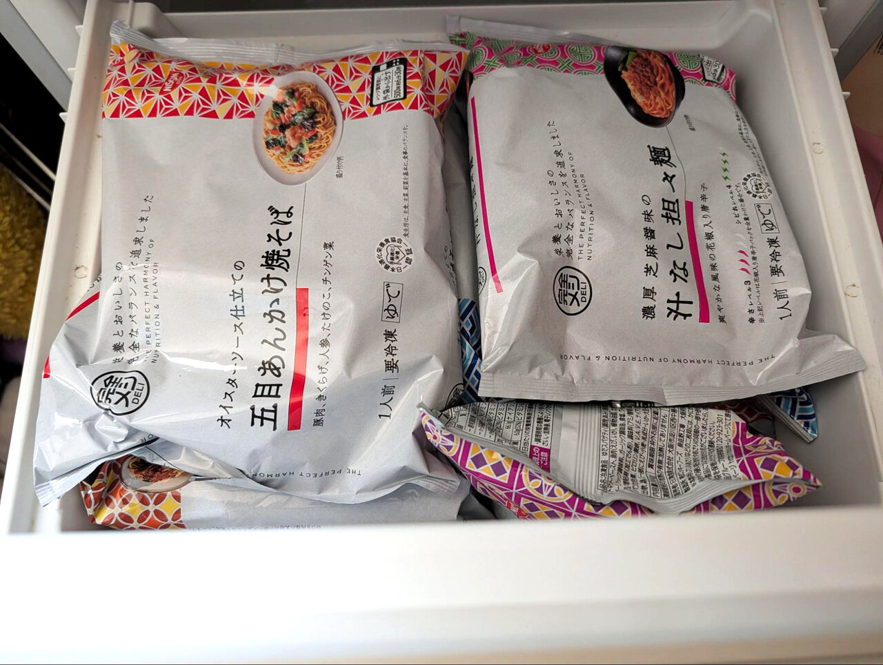 ちなみに、下の写真でお見せした冷凍スペースの容量は約46リットル。ここを空の状態にしておいて、ギリギリ「冷凍 完全メシ DELI 10食Aセット」の全10食分を入れることができました。今回は2セット購入したので、もう10食分が残っていますが、筆者の家にはもう1台の冷蔵庫がありますので、残る10食分はそちらの冷凍庫に入れることで、どうにか全てを収納することができました。