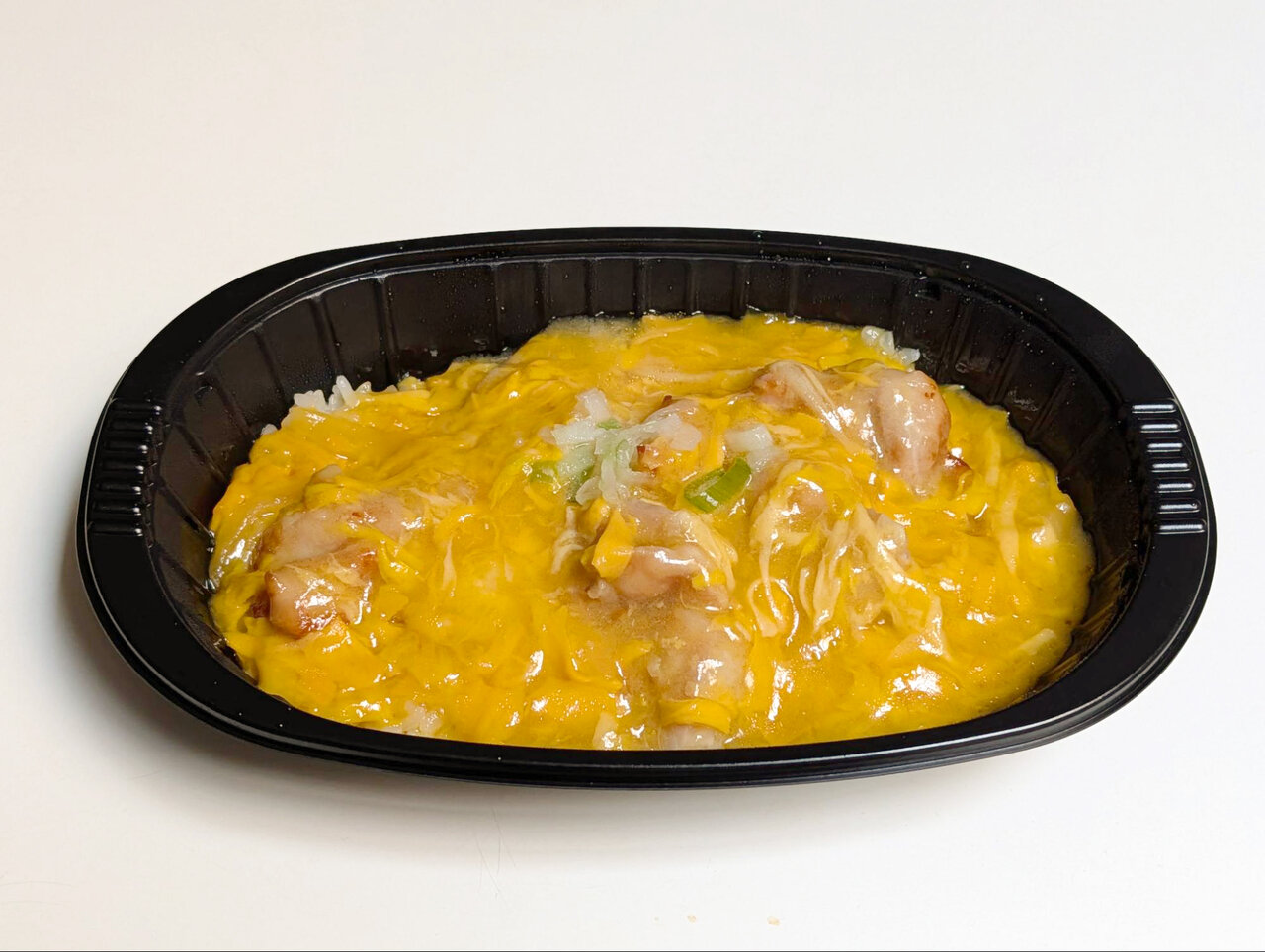「やわらか鶏もも肉の親子丼」もトレーで直接食べられるタイプ。とろとろの卵が食欲をそそります。ごろごろと入った鶏もも肉は一口サイズで食べやすく、あっという間に平らげてしまいました