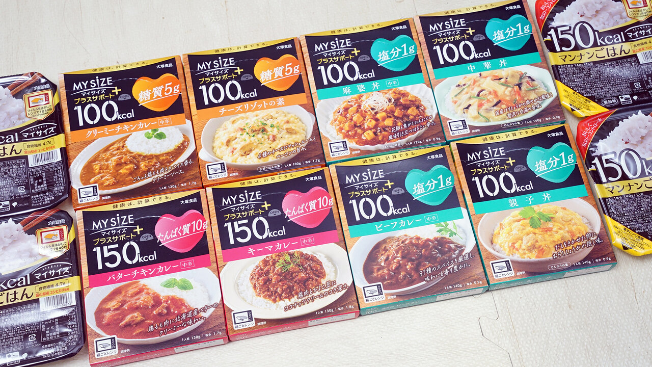 そのため筆者は、以前の記事「全部試した!1食250kcalの「マイサイズ」で一番おいしいのは?」で紹介した12種類の中からお気に入りをストックしていました。しかし、2024年に「マイサイズ プラスサポート」が追加され、2025年12月現在、8種類がラインアップされています。
