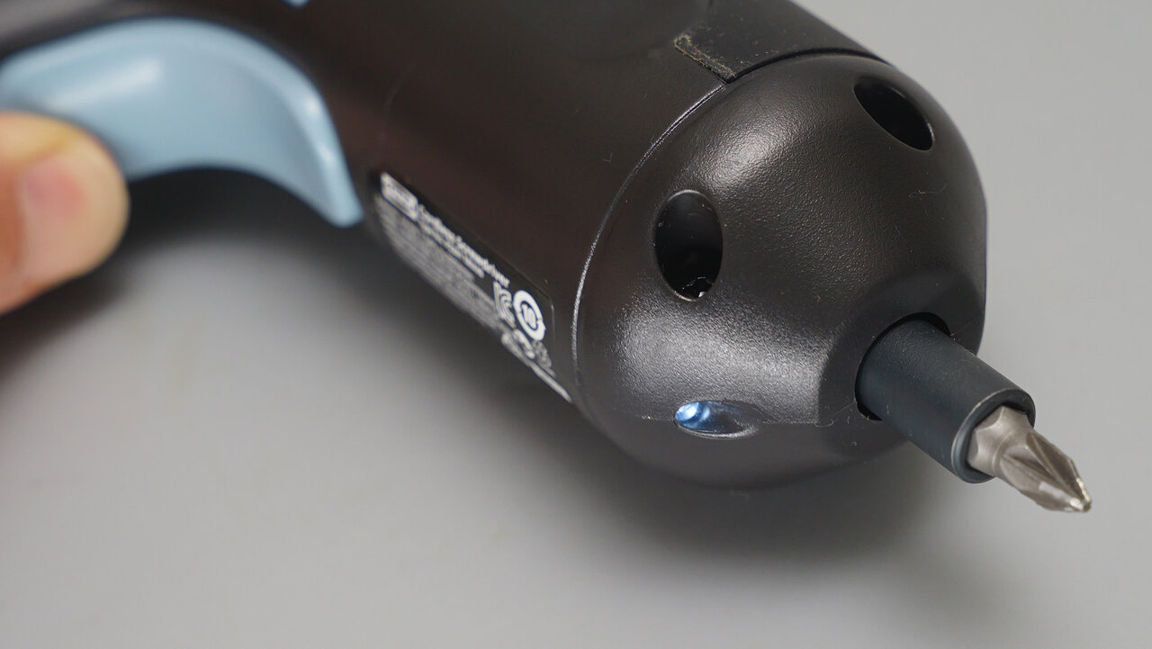 また、トリガーをオンにして回転を行うと、LEDライトが点灯するのはキャンドゥ電動ドライバーと同じ仕組みです。さらに水色のストラップが標準で装着されている点などは、価格的な余裕を感じさせるポイントです。