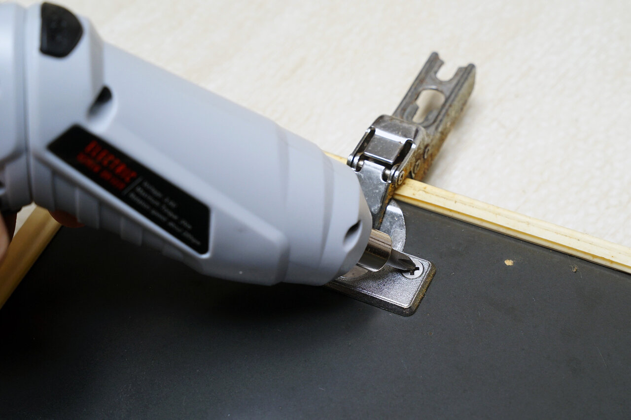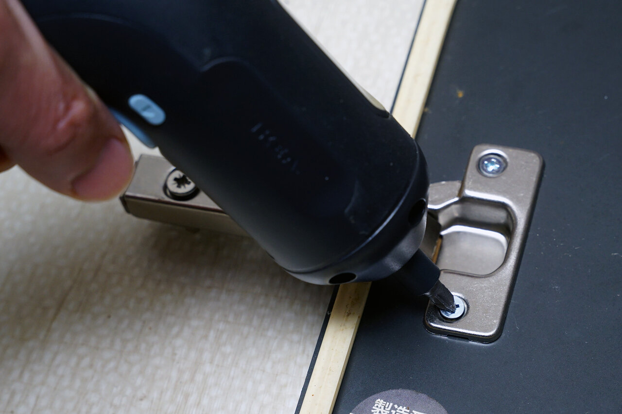 実際の使い心地を比較するために、自宅の食器棚の扉の金具を付け替えてみました。古くなった丁番を交換しようというわけです。10本近いネジの取り外しをする必要があり、手動では面倒な作業です。