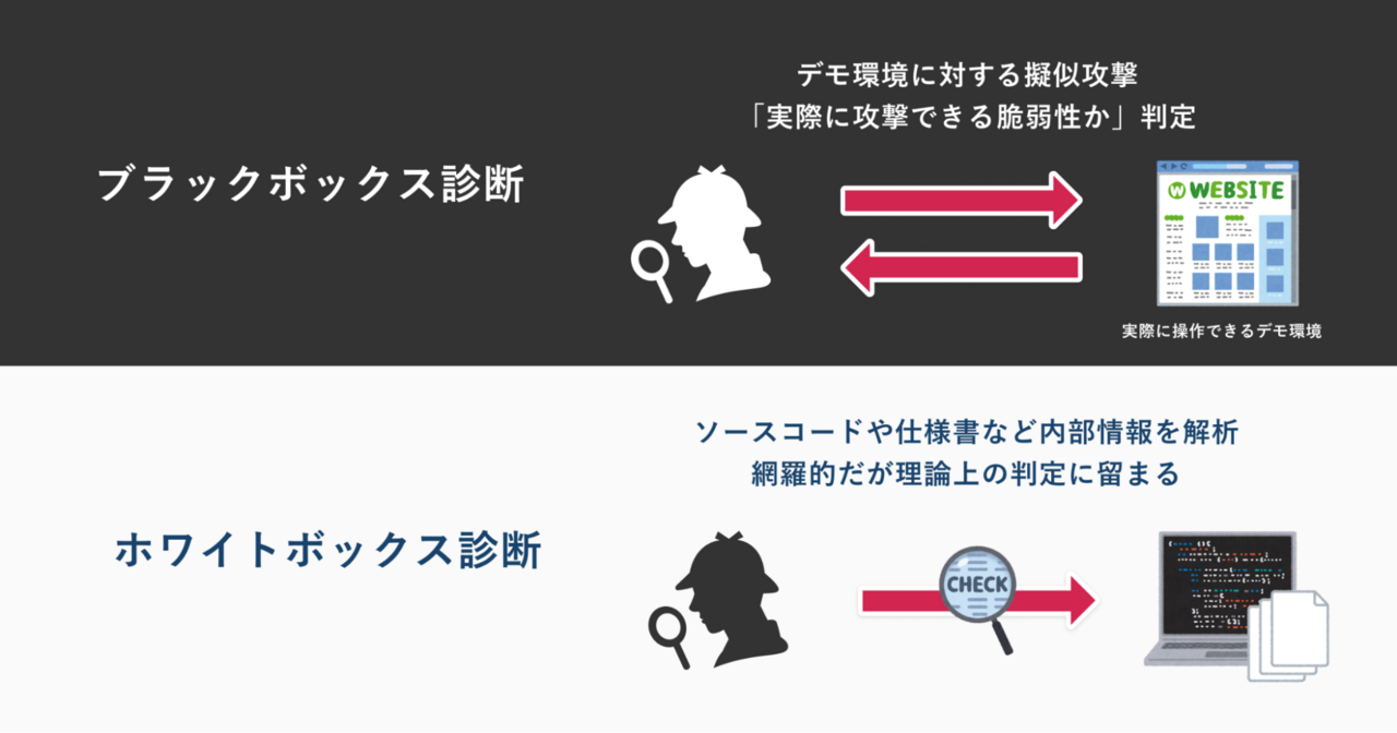 脆弱性を探索する手法には、「ブラックボックス診断(DAST)」と「ホワイトボックス診断(SAST)」と呼ばれるものがあります。それぞれのメリット・デメリットを紹介しましょう。