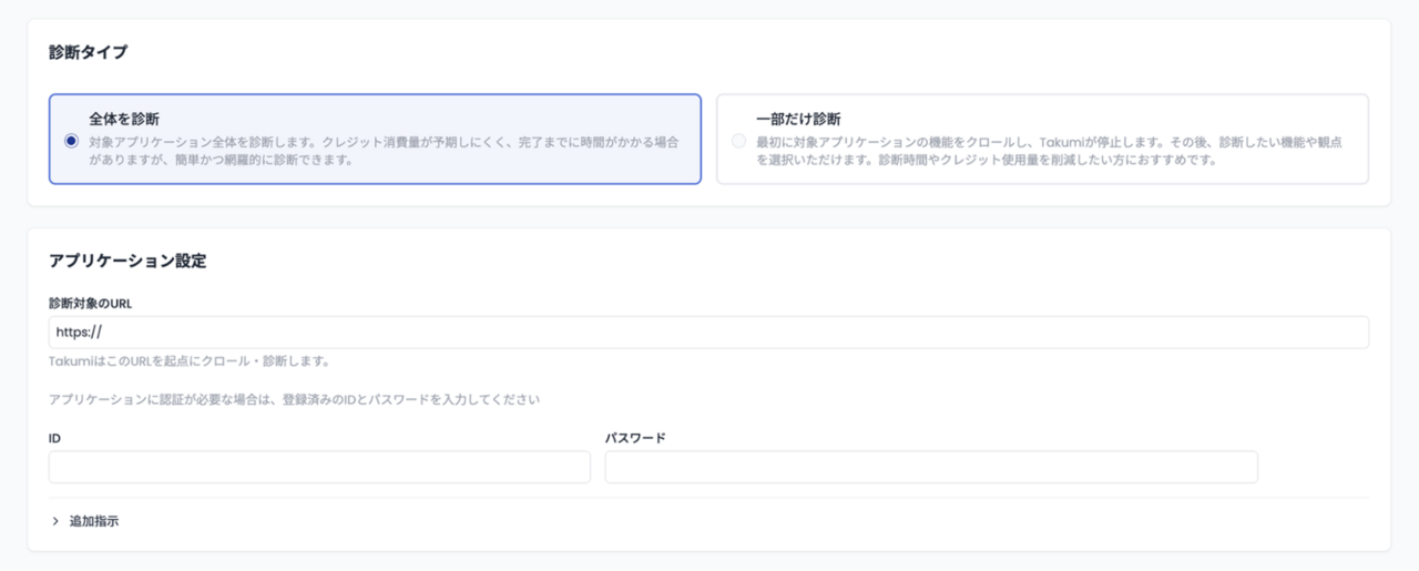 ブラックボックス診断機能は、従来のTakumiのメイン画面「チャットUI」ではなく、専用の管理画面から利用します。管理画面で、デモ環境のURLとログインに必要な情報などを入力するだけで、AIが自動的に診断対象画面・通信の洗い出し(クロール)を開始します。従来は多くのDASTツールが必要とした、画面URL一覧などの詳細な診断対象データの準備は不要で、誰でも簡単に診断を開始できます。