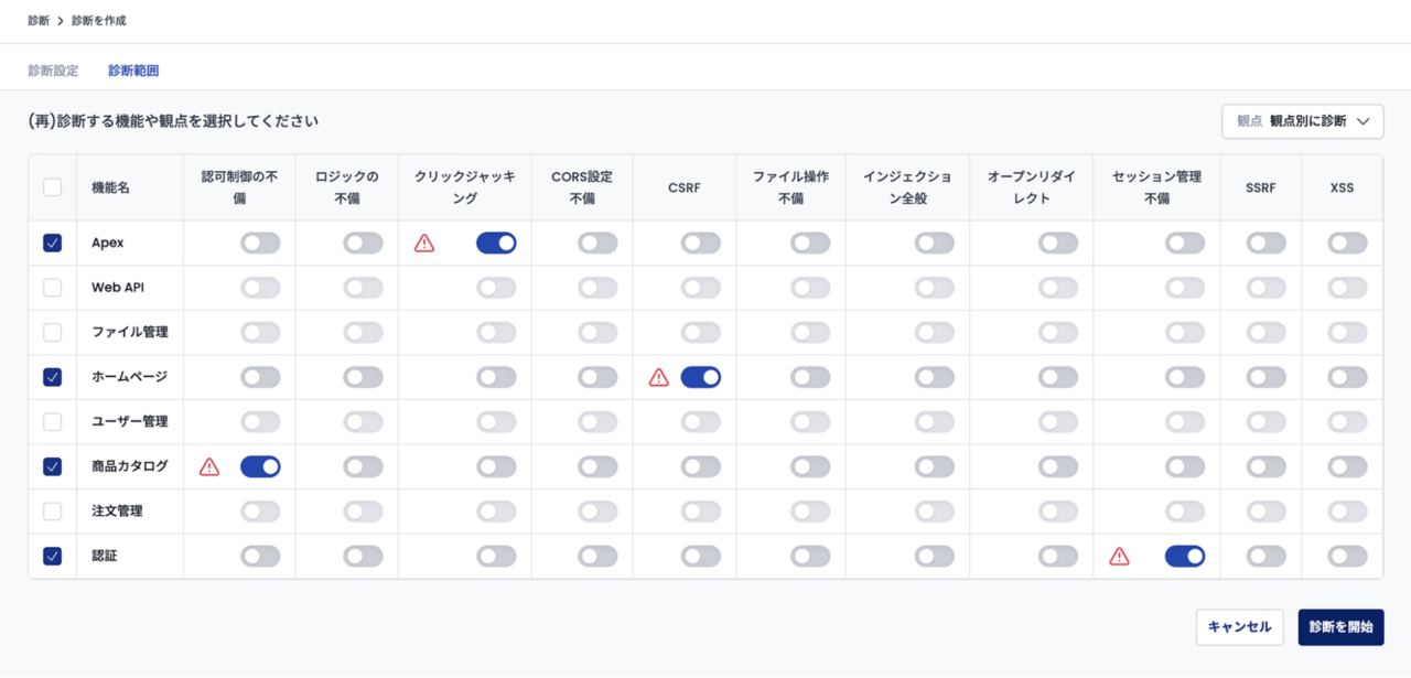 診断する対象や脆弱性を絞り込んだ診断もできる
