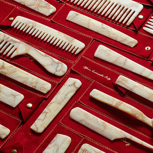 オフィシーヌ・ユニヴェルセル・ビュリーのアセテート素材の美しいコームは、まるでアンティークのような佇まいで、そこにあるだけで絵になります。